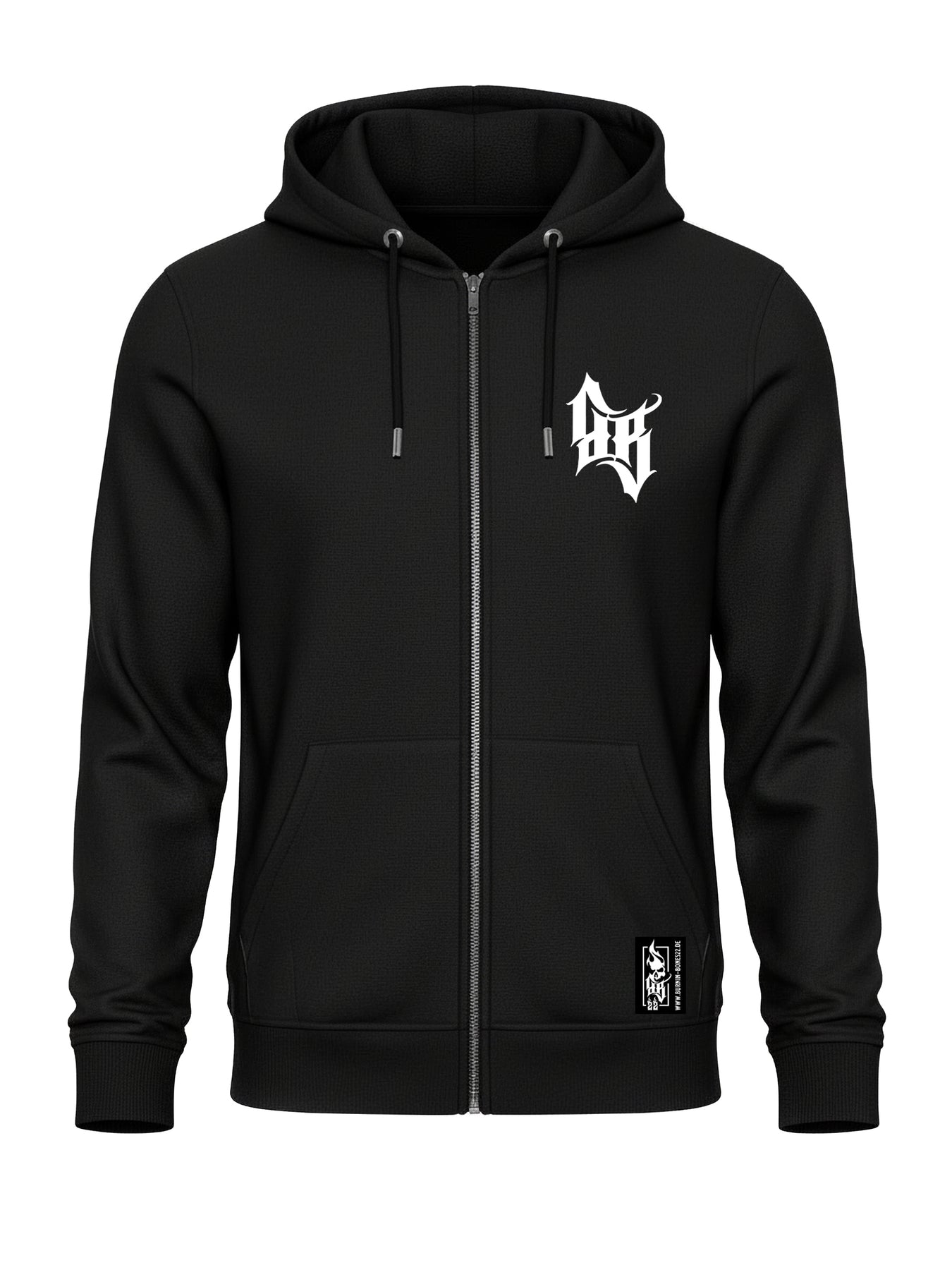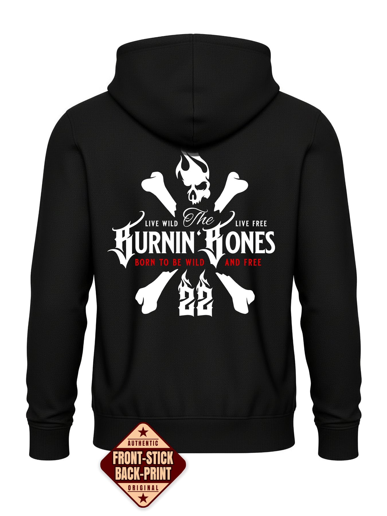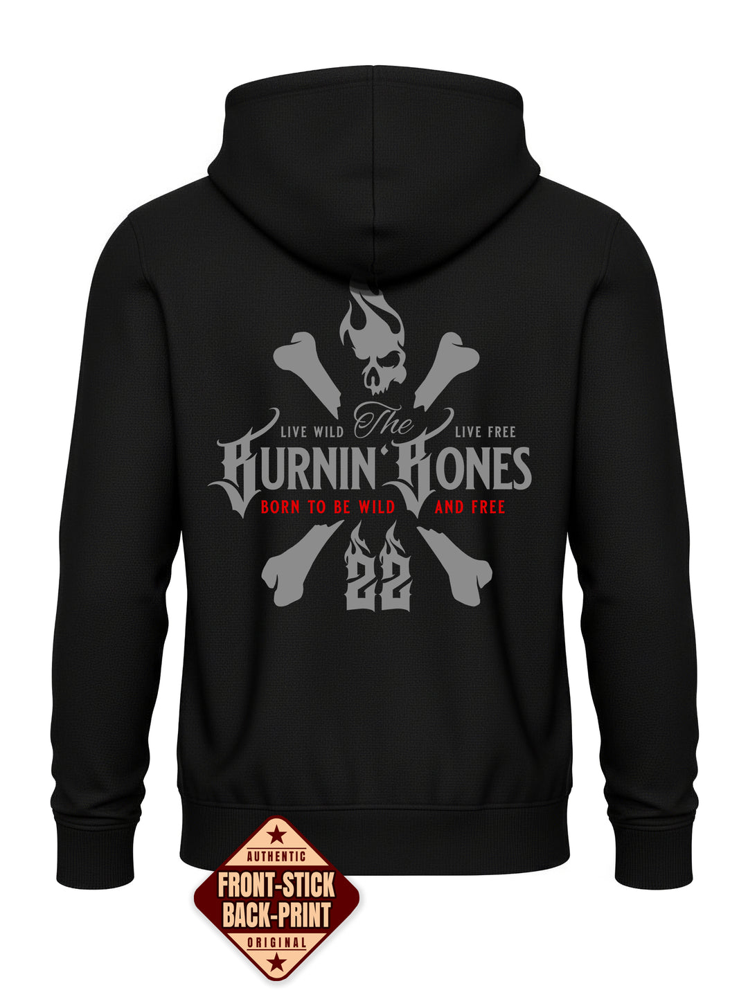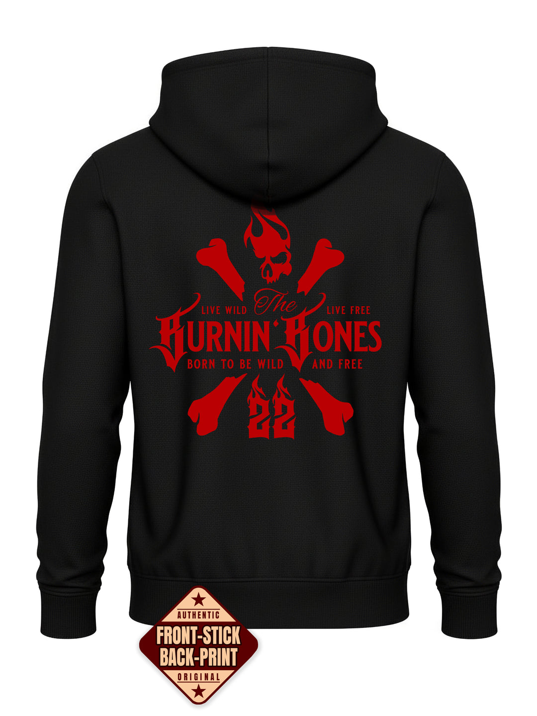 Auf der Brust befindet sich das BB-Stickmotiv als Ausdruck der Markenidentität. Der große Rückenprint mit dem Burnin’ Bones-Schriftzug, gekreuzten Knochen und dem charakteristischen Skull von BB22 sorgt für einen auffälligen Look. Das Design greift die Themen Freiheit und Entschlossenheit auf und unterstreicht den individuellen Stil.
